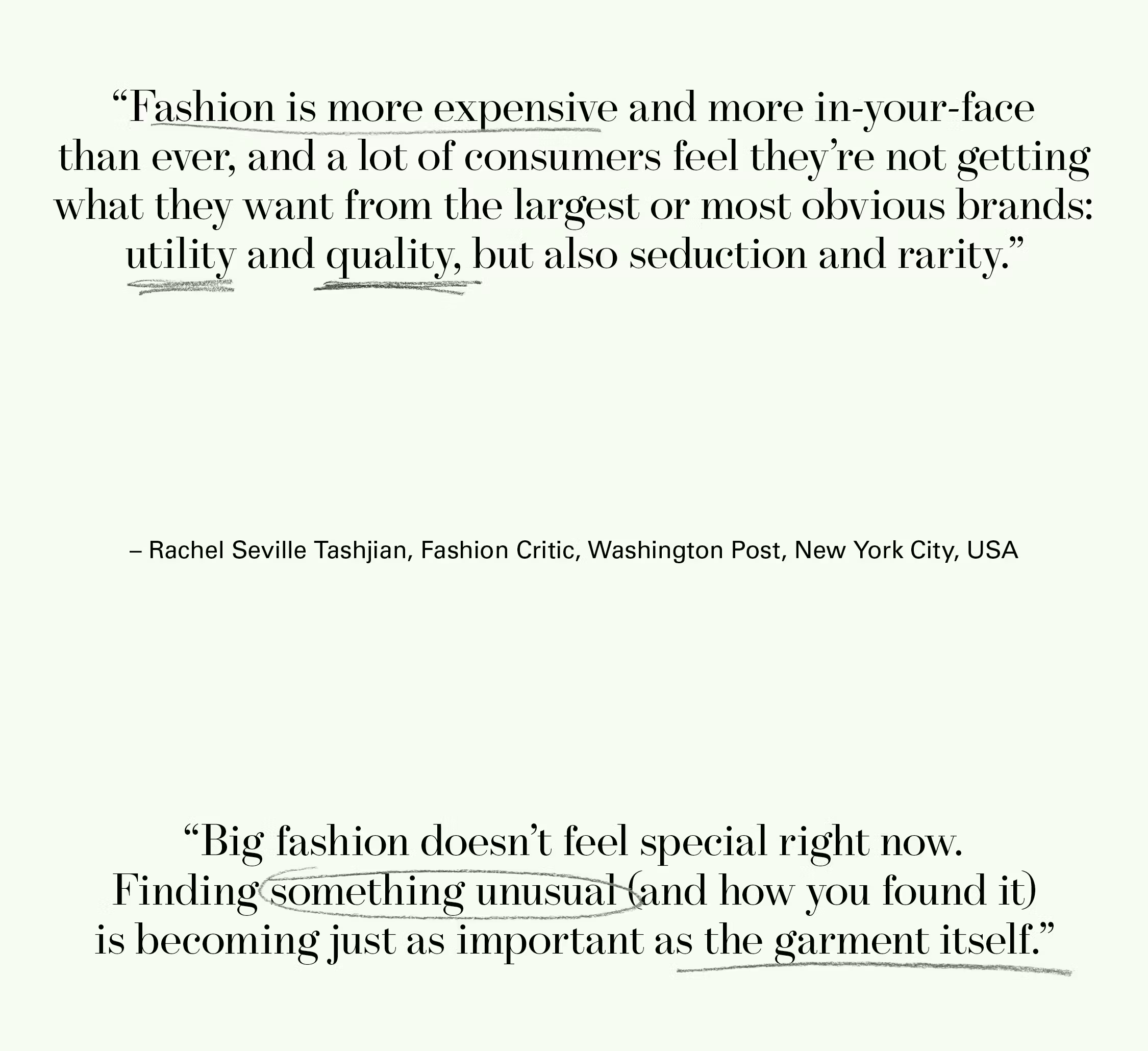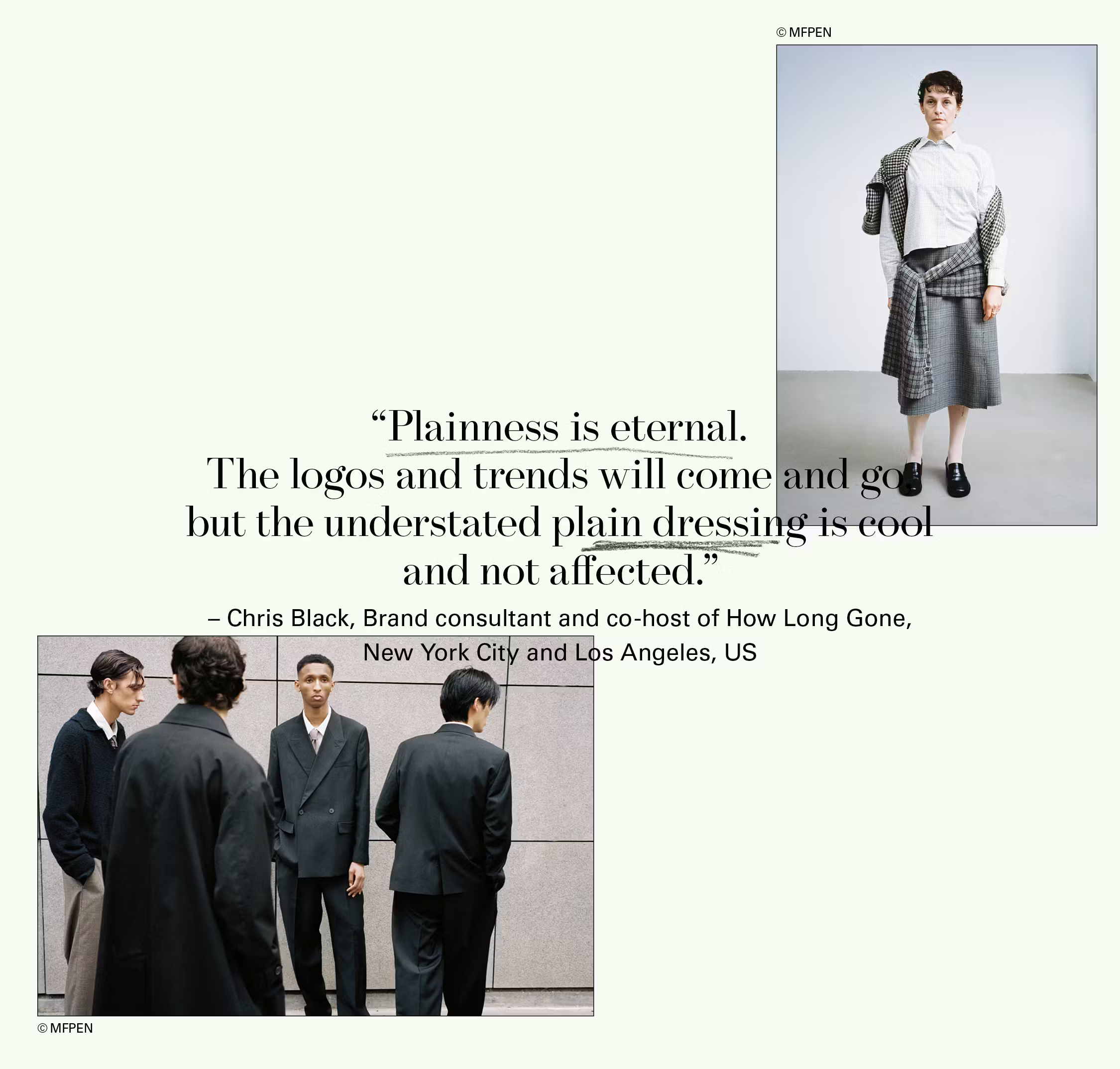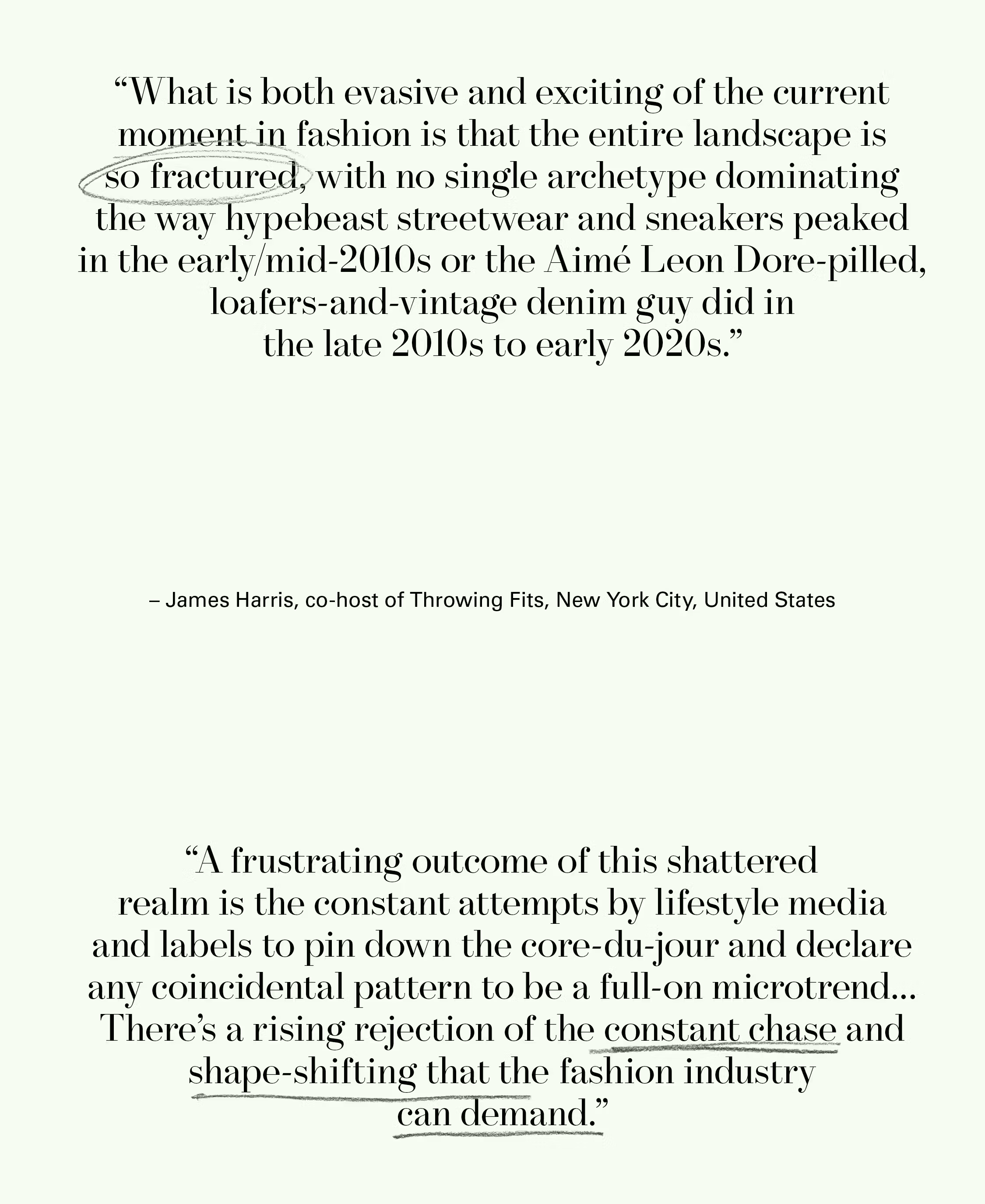 “Despite the ever-increasing push for commercialization, there are always bright spots of independence. Fashion is, at its core, a creative industry, and I believe originality and dynamic voices will continue to break through.” —Jesse Hudnutt, Fashion Consultant, New York City, USA