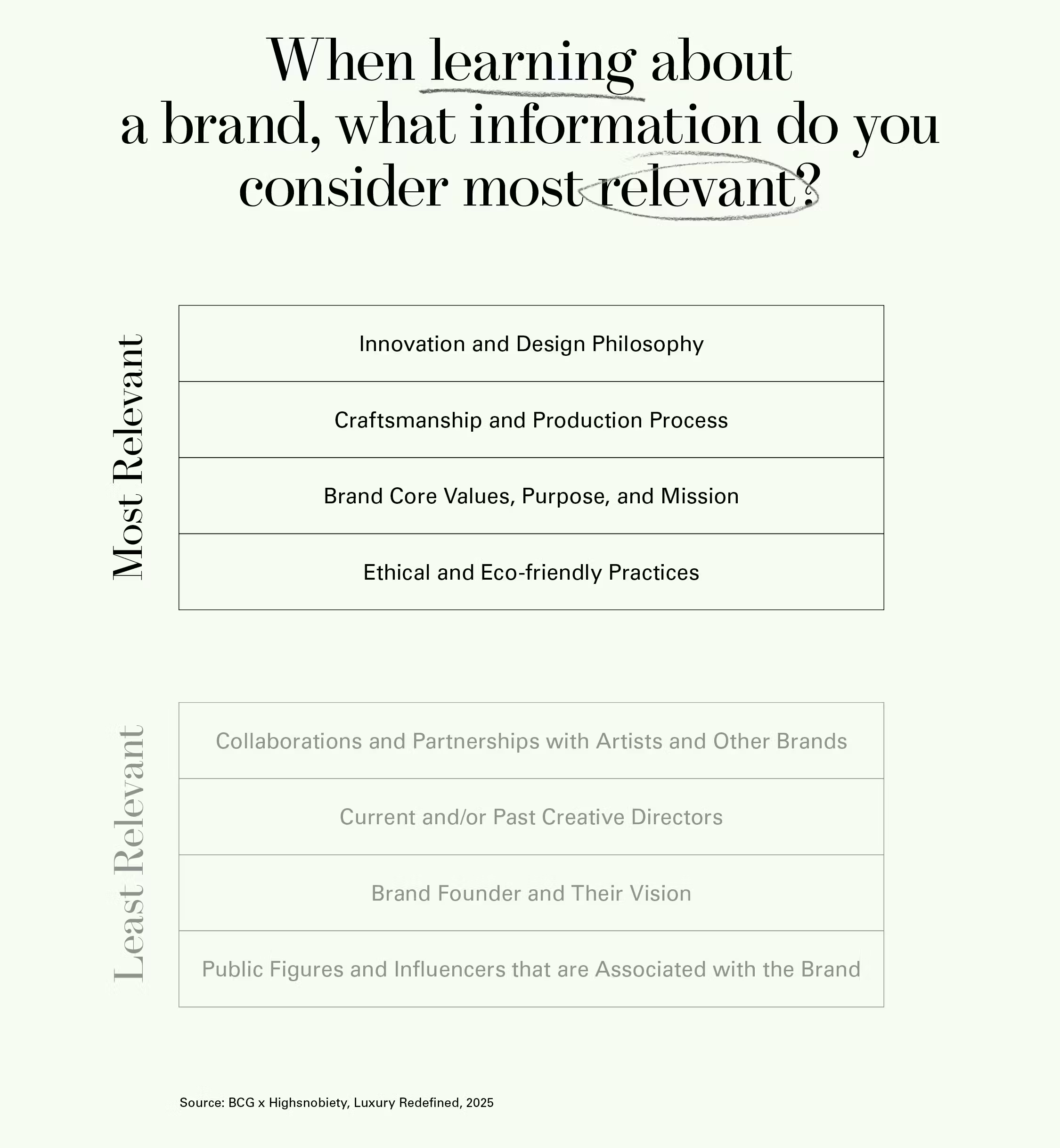 Within the entirely different markets and headspaces of 2025, we’re looking back at these and other studies while examining what has changed and what has stayed the same. Anecdotally, brands with more consistent storytelling, be they young or centuries old, are in. Novelty acts such as the aforementioned artist collabs and limited drops, less so.