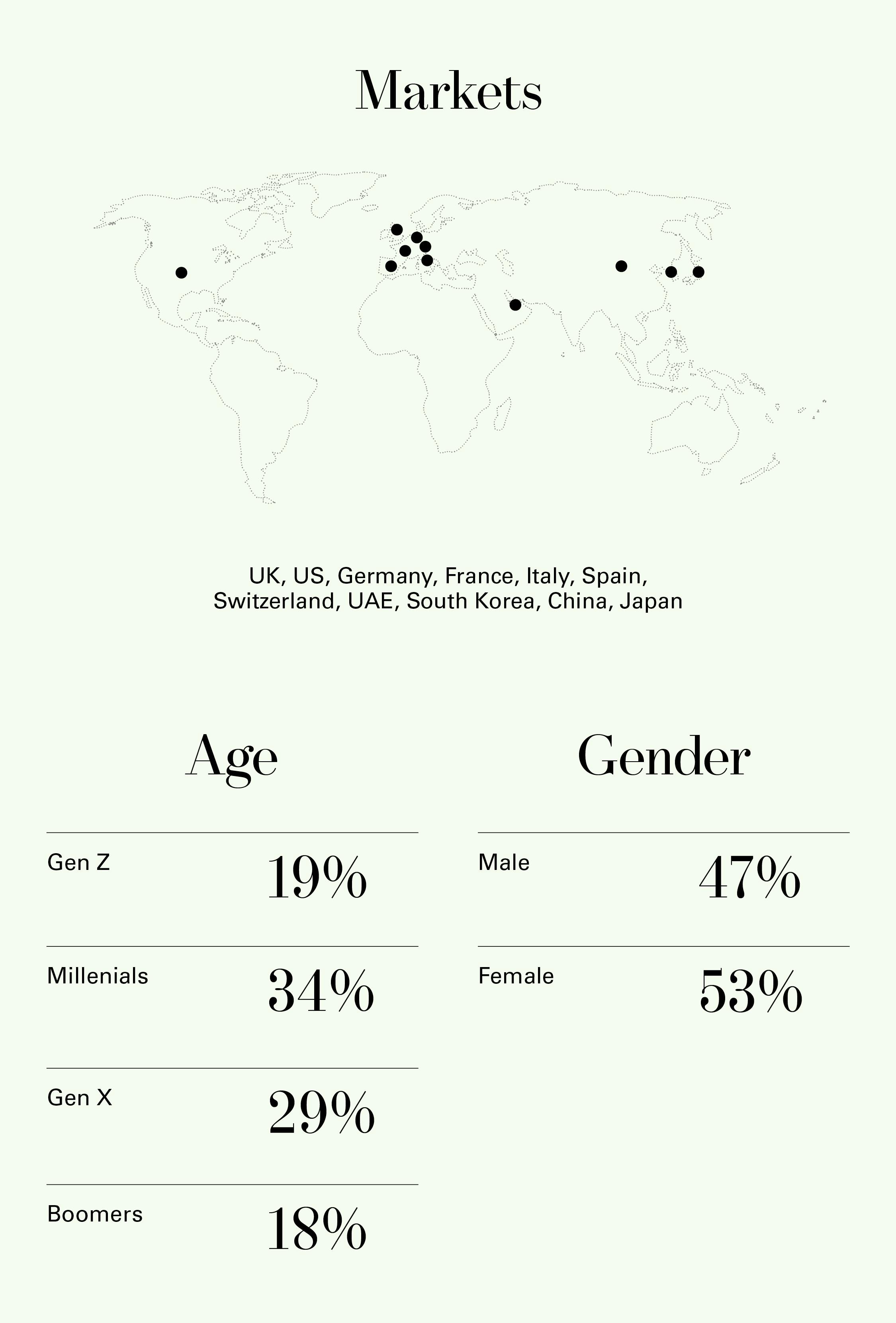 We conducted a survey in partnership with Boston Consulting Group. Our largest yet, it interviewed 6,710 respondents across 11 key markets: China, South Korea, Japan, the US, the UK, Spain, France, Italy, Switzerland, Germany, and the UAE.