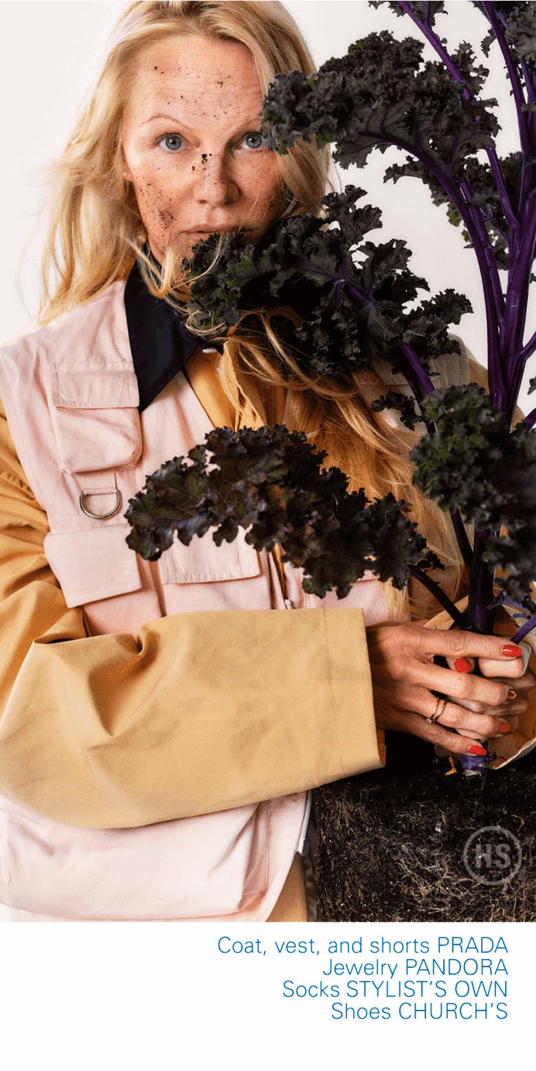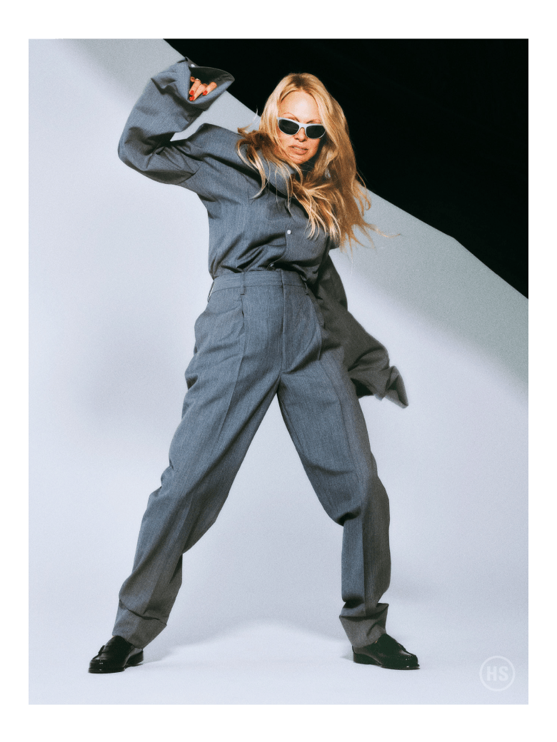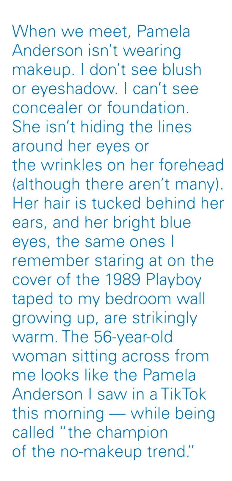 “No Cetaphil?” I ask, speculating on what must go into this whole no-makeup thing. “No, I’m a tomboy! I was actually always a tomboy growing up,” she confesses, as if this is still a surprise to her, even though she put it in her recent memoir, Love, Pamela, and says as much in the 2023 Netflix documentary Pamela, A Love Story. “I never wanted to wear a dress. I was athletic. I made mud pies,” she says, gesturing with her left arm, as if her childhood were sitting next to her, just offscreen.